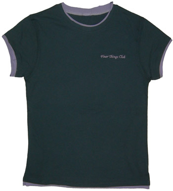 "Finer Things Club" is embroidered in lavender thread on an eggplant and lavender 100% cotton jersey shirt.